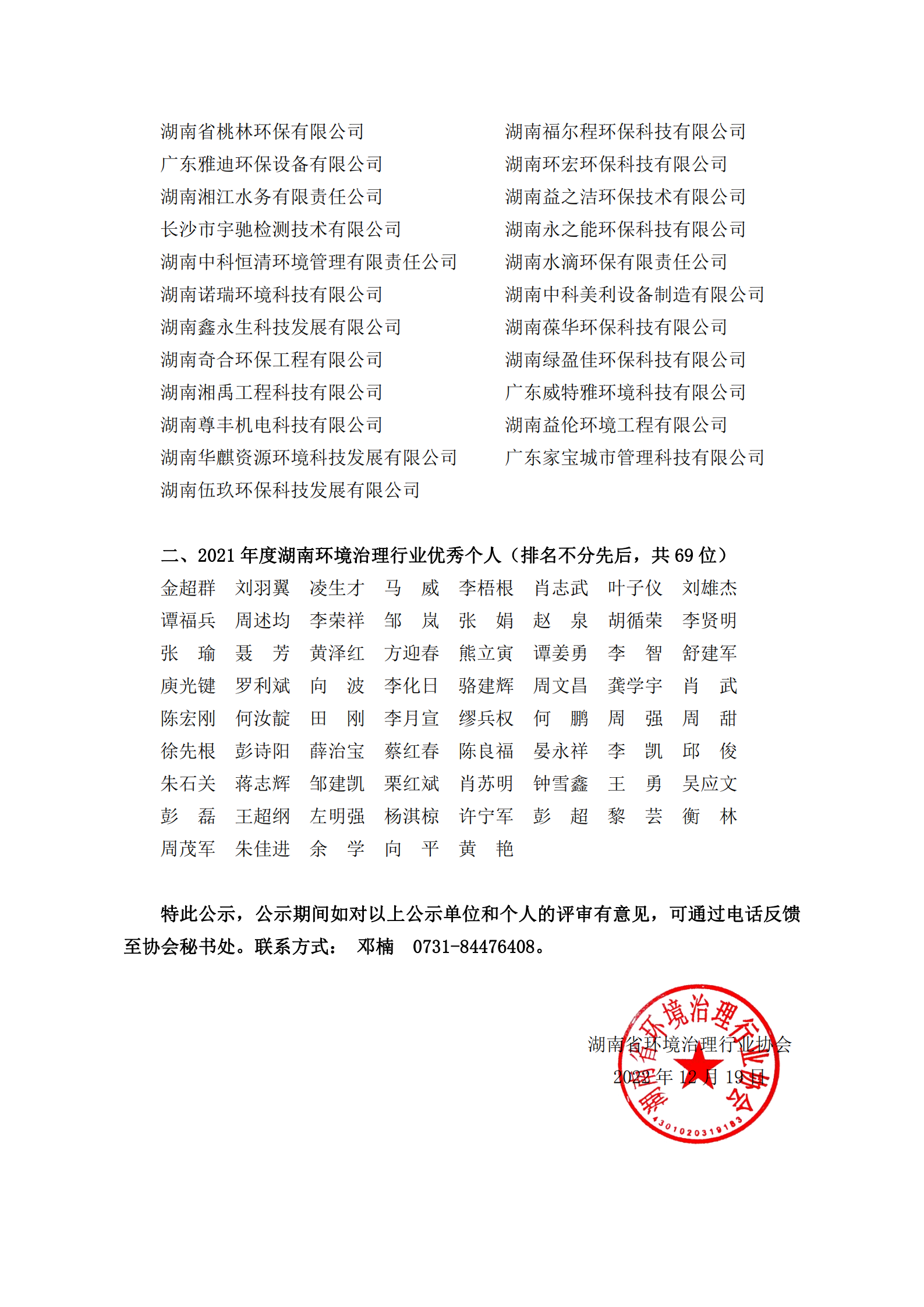 为表彰企业和个人,树立典型,促进环境治理行业健康发展,湖南省环境治理 行业协会在 2022 年开展“2021 年度湖南环境治理行业优秀单位和优秀个人”评选活 动,本次评选由企业自愿提交评审材料,协会按照相关程序,经过严格审查,组织 人员进行评审,下列 123 个单位荣获“2021 年度湖南环境治理行业优秀单位”,69 位个人荣获“2021 年度湖南环境治理行业优秀个人”。 为进一步增加评选工作的透明度,决定对拟获奖企业和个人进行公示,公示日 期为 5 个工作日,从 2022 年 12 月 19 日至 12 月 23 日。如有异议,可在公示期内向 协会秘书处提出,逾期不予受理。
