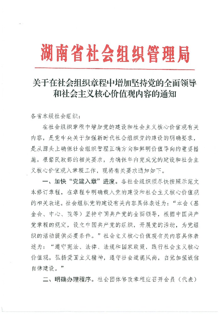 关于在社会组织章程中增加坚持党的全面领导和社会主义核心价值观的通知