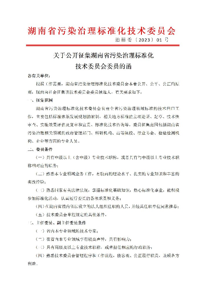 关于公开征集湖南省污染治理标准化技术委员会委员的函