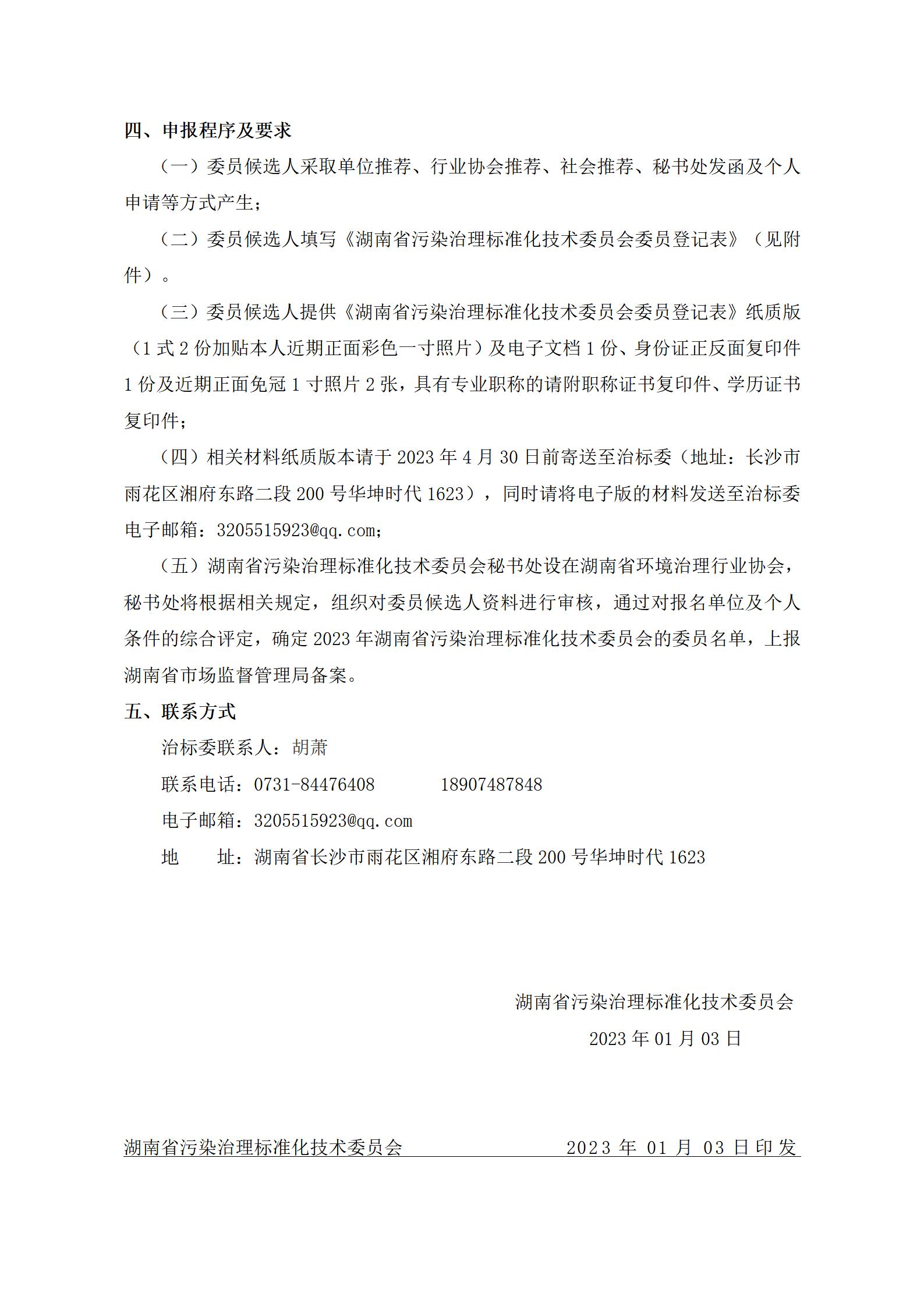 (五)湖南省污染治理标准化技术委员会秘书处设在乐鱼电竞,秘书处将根据相关规定,组织对委员候选人资料进行审核,通过对报名单位及个人条件的综合评定,确定2023年湖南省污染治理标准化技术委员会的委员名单,上报湖南省市场监督管理局备案