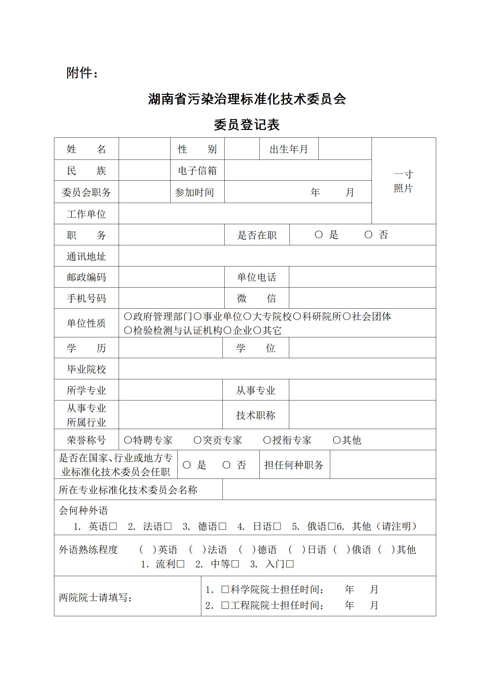 (二)委员候选人填写《湖南省污染治理标准化技术委员会委员登记表》(见附件)。